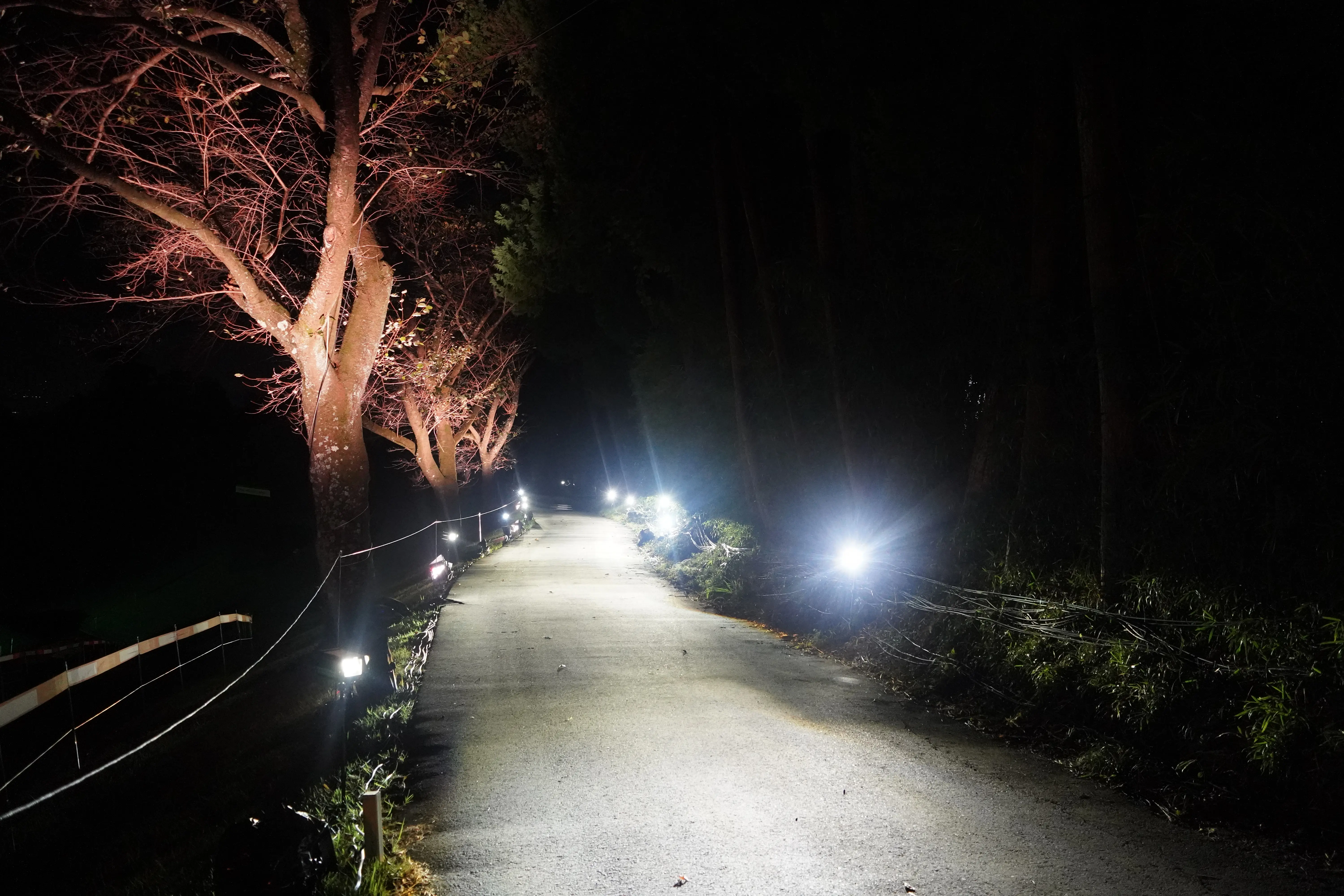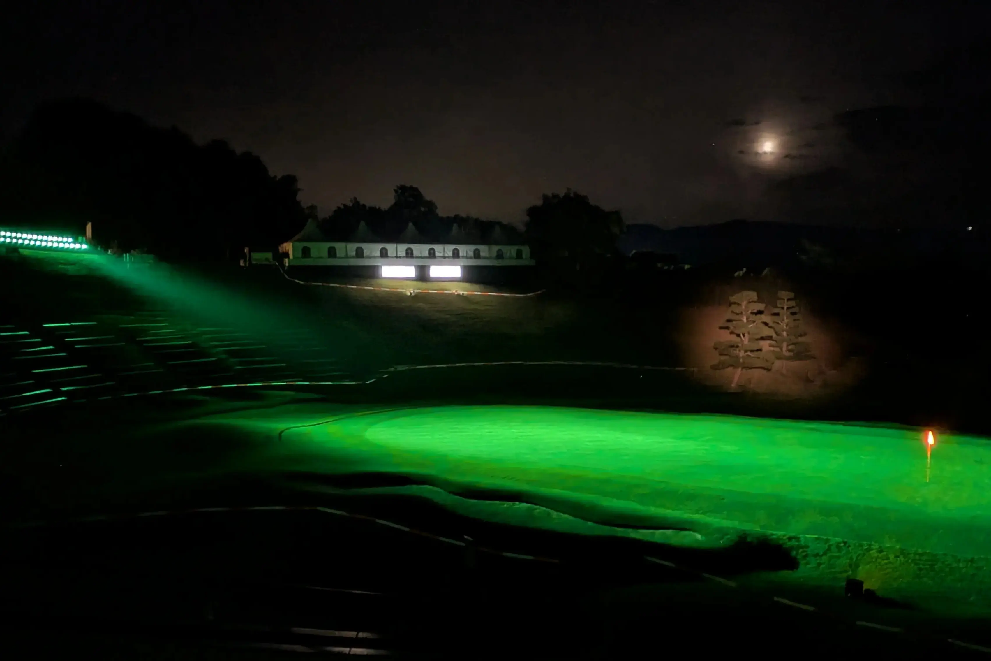 在作为最终洞的18号洞,我们使用LEDSFOCUS PRO FULLCOLOR实现了均匀无斑驳的照明效果。灯光仅照射球场果岭区域,并通过缓慢变换绿色光效,表现草坪随风摇曳的动态美感。此外,球洞中央的旗杆使用了LEDSFOCUS PRO GOLD照明,将光线集中在旗杆上,使旗杆在果岭上更加醒目。此外,我们使用LEDSFOCUS PRO照射了本公司与特别赞助商本田汽車工业株式会社的企业标识。在夜间高尔夫球场上,仅最后一个球洞、旗杆和企业标识被点亮,营造出梦幻般的氛围,堪称特殊照明的杰作。