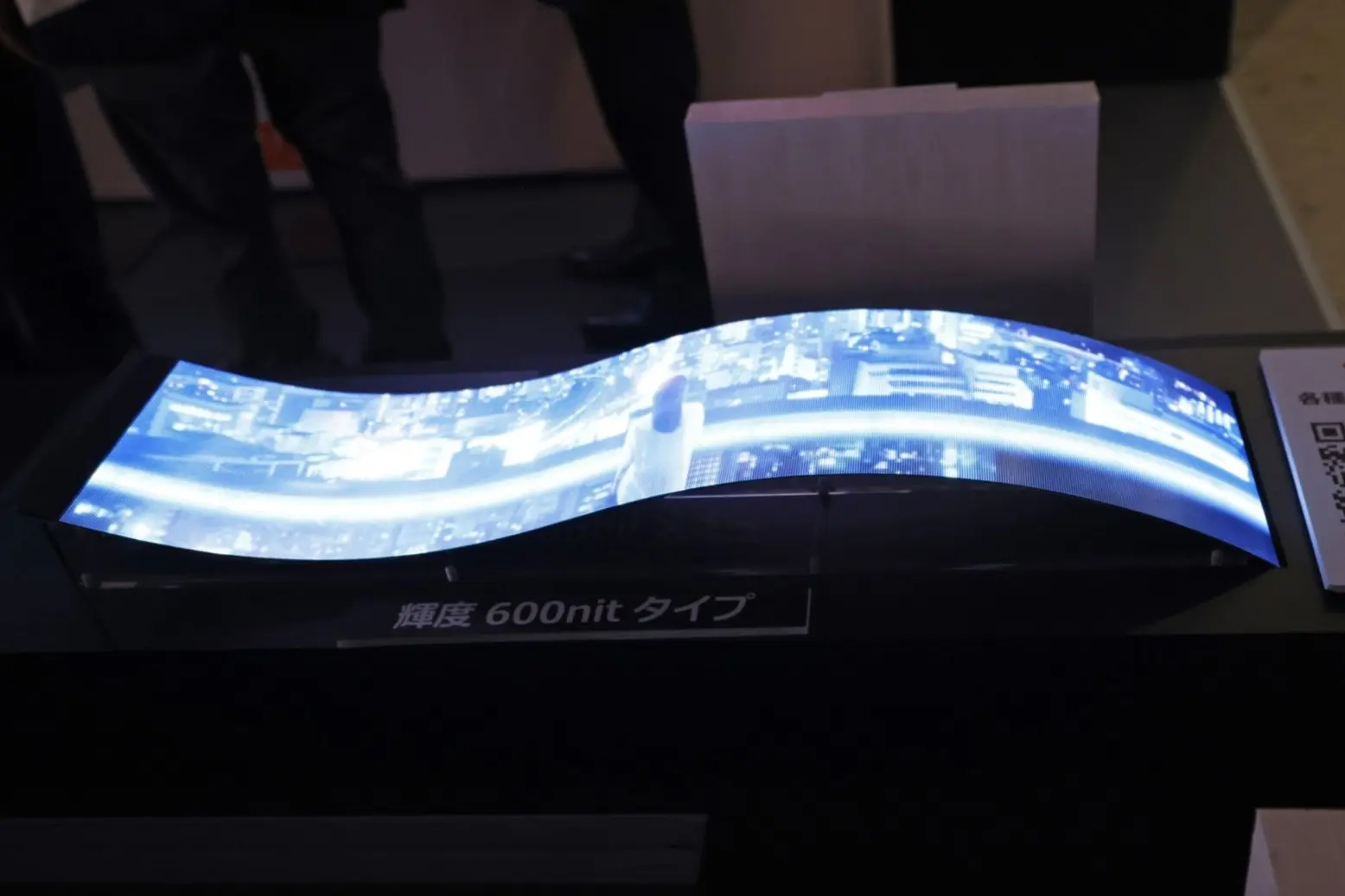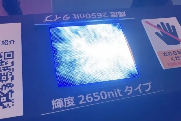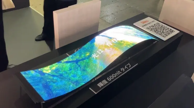 采用W686×H150mm(约)的标准长条形规格,通过弯曲展示直观呈现其柔韧特性。现场备有样品供参观者亲手触摸,不仅能感受其纤薄特性,更能体验轻盈与柔韧的质感。常规型号亮度为600nit,为展示未来高亮度化研发潜力,特别参考展出亮度达2650nit的高亮型号。更明亮的型号将拓展户外等应用场景的可能性。
