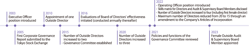 The Audit & Supervisory Board, which includes multiple Outside Audit & Supervisory Board Members, works to ensure the effectiveness of the Company’s governance. This is achieved through audits conducted in active cooperation with the Accounting Auditors and internal audit department as well as the preparation of management strategies and supervision of the executive function by the Board of Directors. Collectively, these initiatives ensure prompt and accurate decisions on business management based on robust discussion. Furthermore, steps are taken to strengthen the governance function by adding independent Outside Directors with extensive experience and management insight.