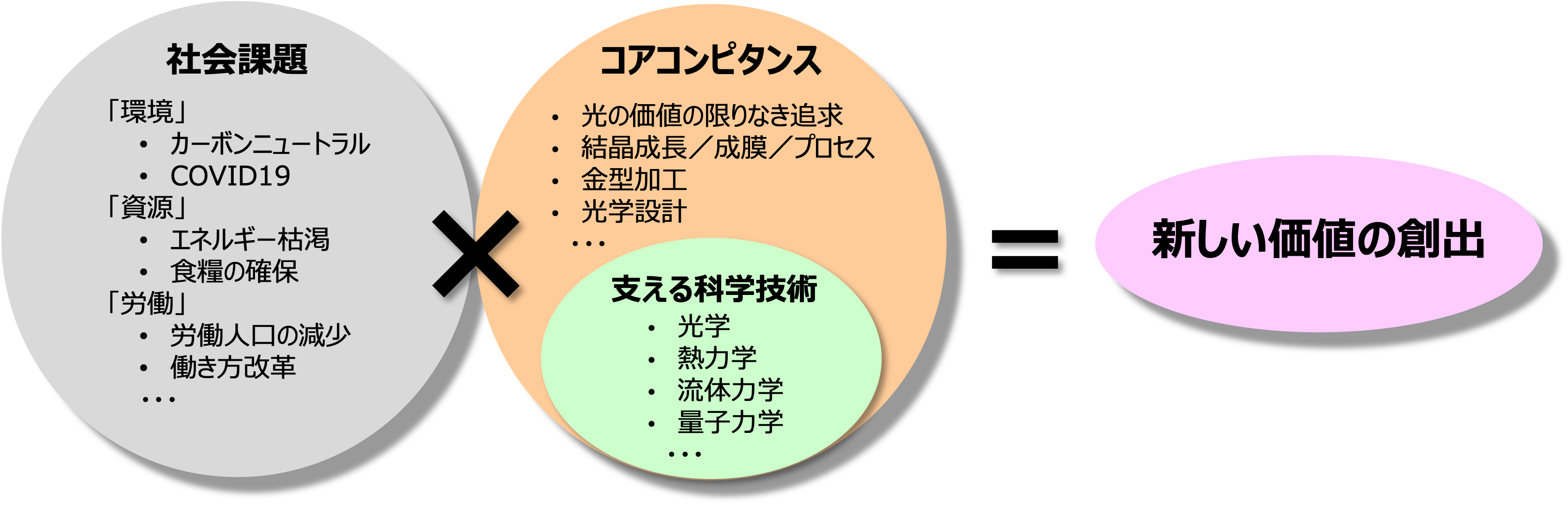 時代と共に変化し続ける社会課題に対し、コアコンピタンスとこれを支える科学技術を探求することで、新事業の柱となる新しい価値を創出し続けることを目指しています。