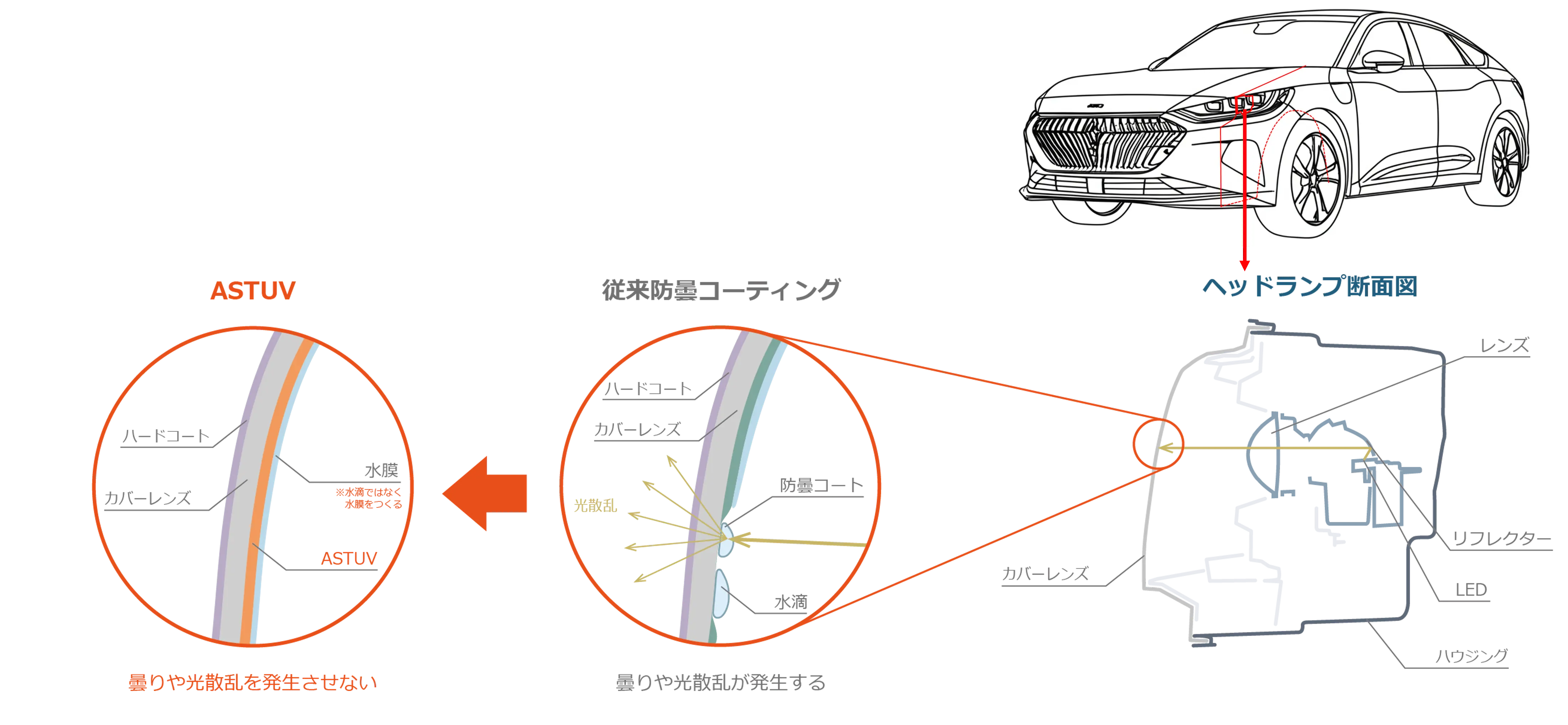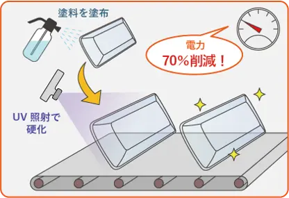 ASTUVは、新たに開発した塗料と、当社独自の光学設計で培ったUV照射(照度・照射距離・照射時間などの硬化条件を最適化)による硬化技術との組み合わせです。自動車用ランプ製造のコーティング工程において消費電力量が高い熱風乾燥工程を無くすことが可能となり、CO₂排出量削減と製品の品質向上に貢献します。第一弾として防曇技術、第二弾にハードコート技術、第三弾に意匠部材の加飾技術に関するイノベーション実現を予定しており、ASTUVの適用範囲を広げていきます。