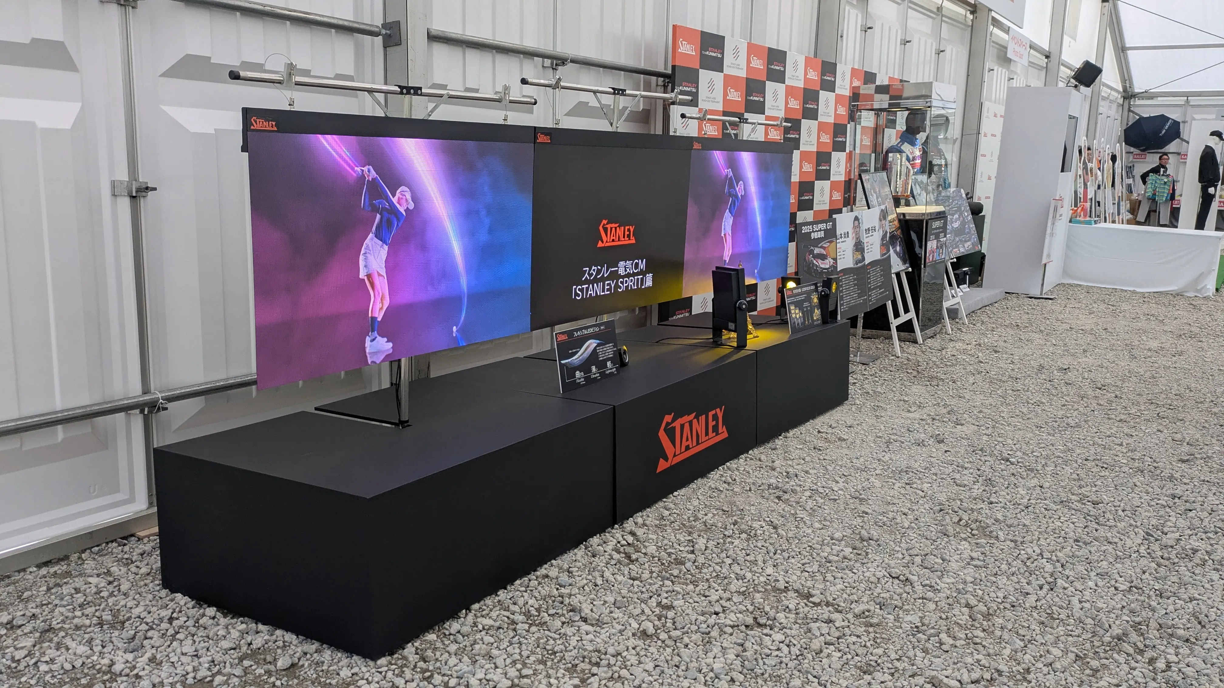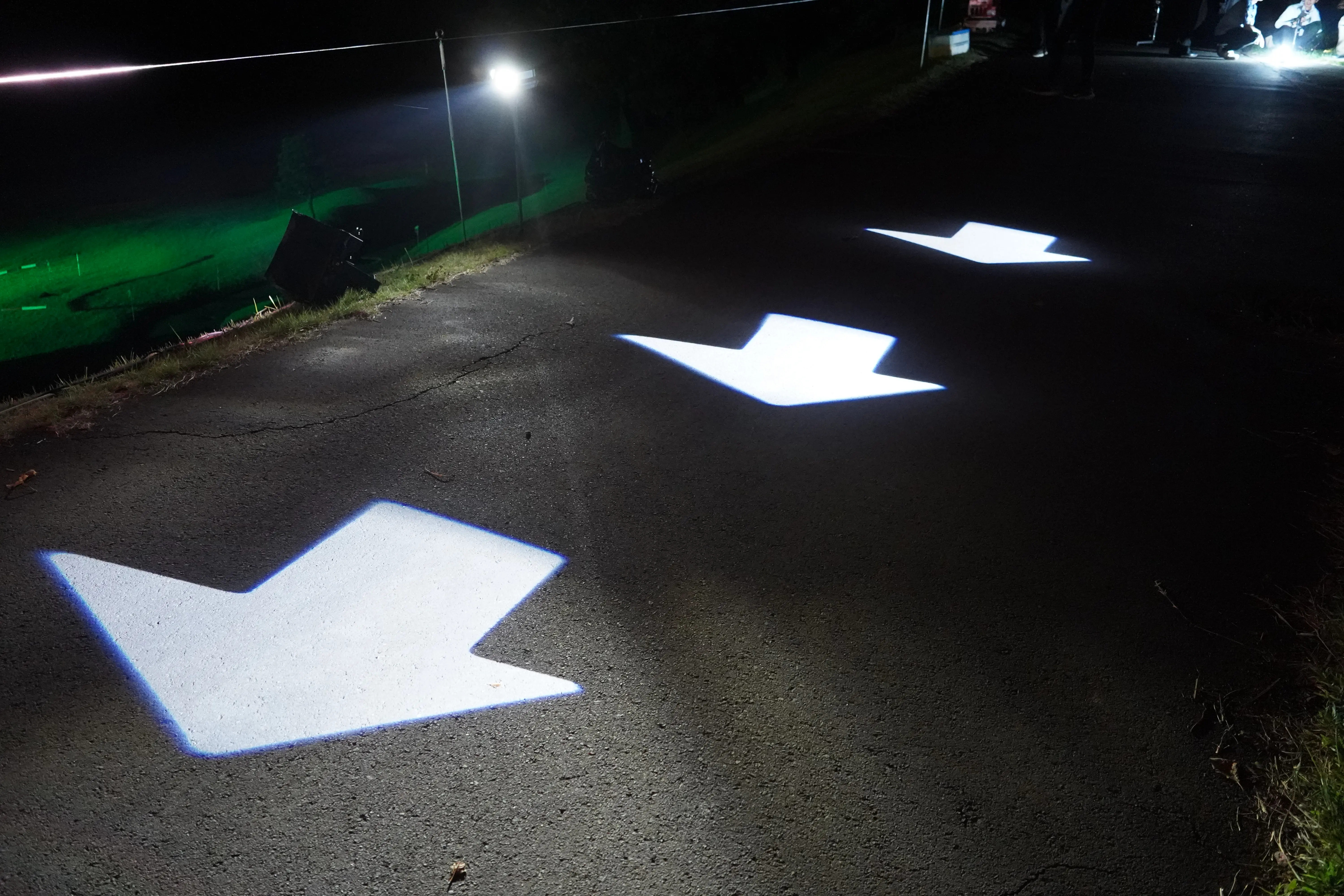 夜のゴルフ場に、最終ホールとフラッグ、企業ロゴだけが浮かび上がり、レースのワクワク感を高める演出となりました。