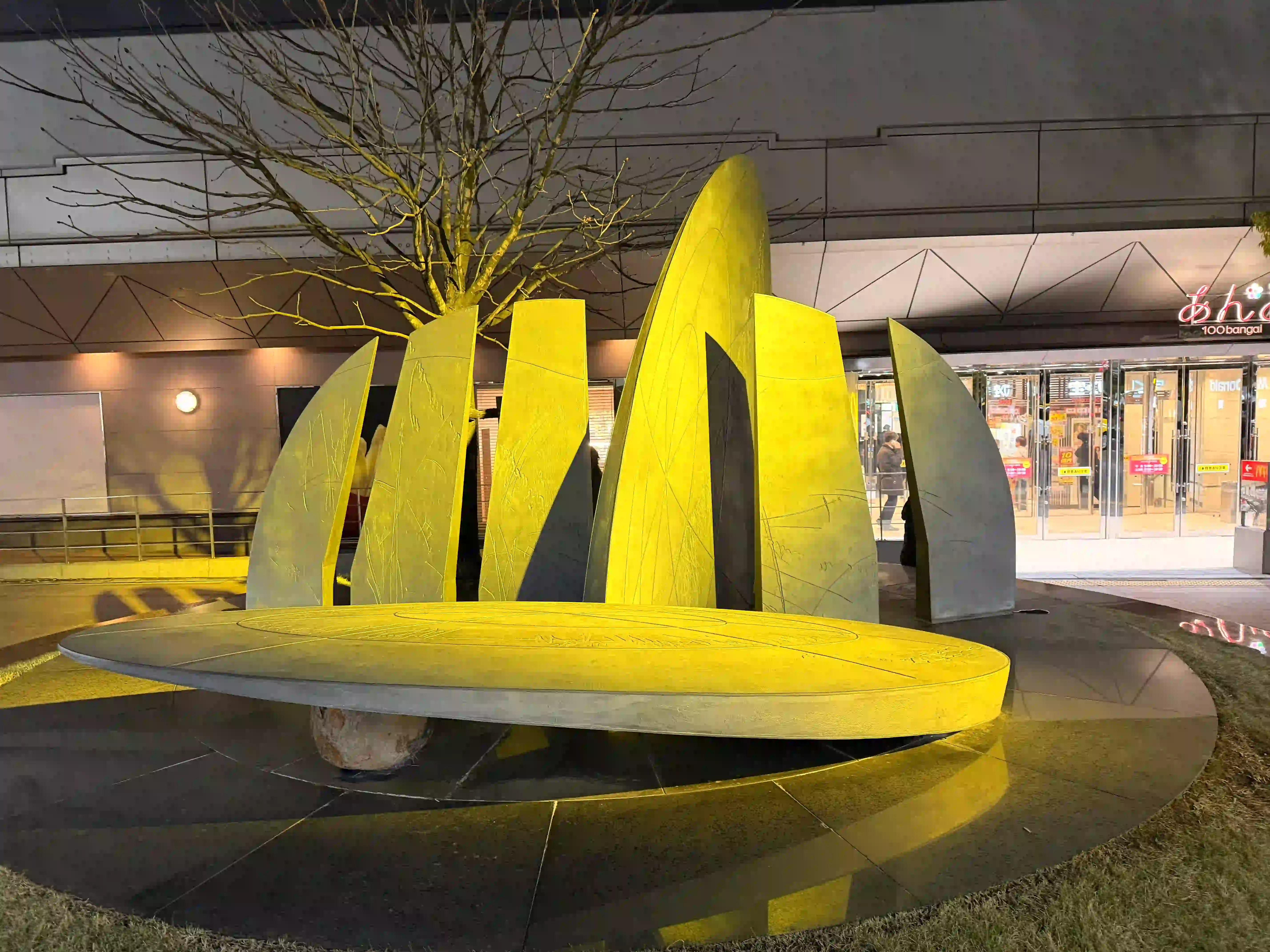 金沢駅彫刻と人工池を金色投光器でライトアップ(金沢市役所様)