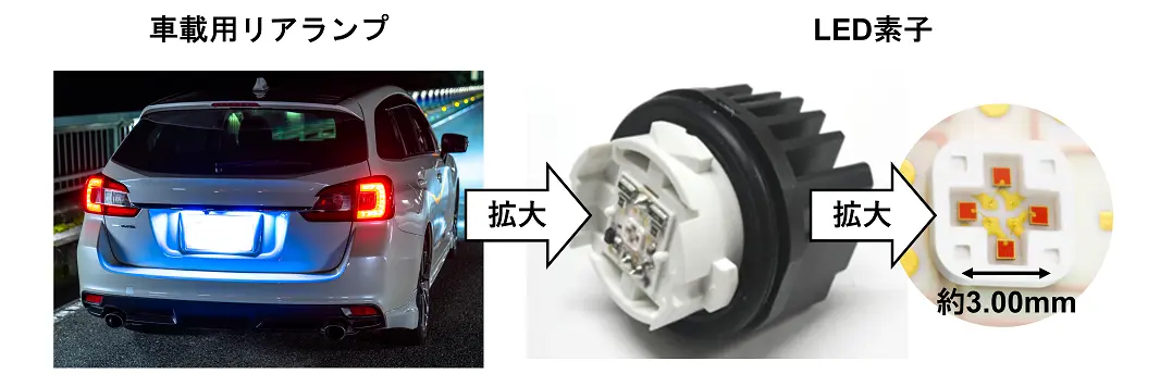 車載用リアランプ光学設計やデザイン上の制約により実装面積が限られるため、高出力のLEDを高密度に配置できる「COB技術」が採用されています。