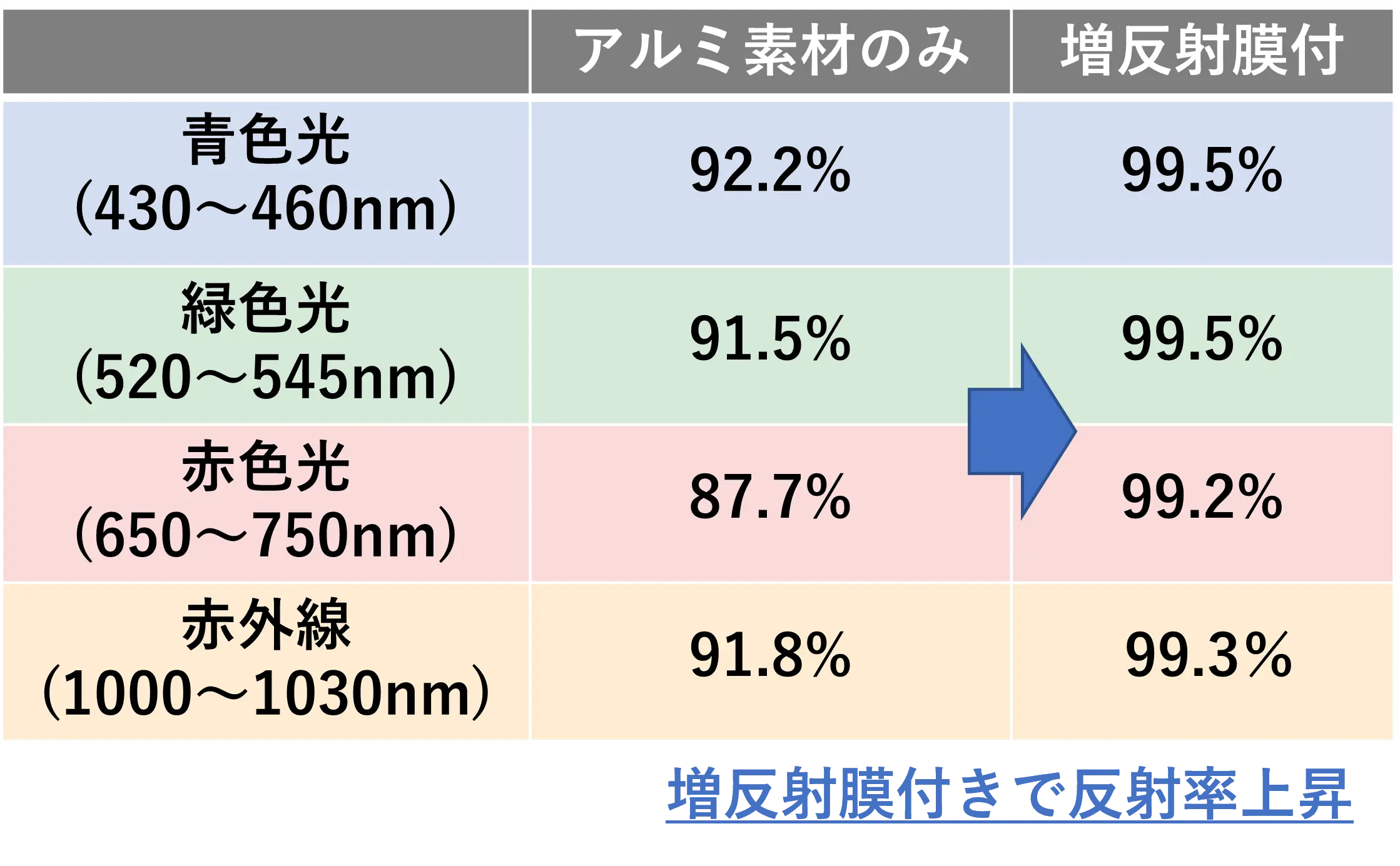 通常、ミラー面は入ってくる光の角度によって反射率が変化する特性がありますが、このミラー面に増反射膜を施すことで、特定の光を角度関係なく均一に反射することを実現します。また、膜の構成を工夫することで、反射率そのものの向上も可能になります。