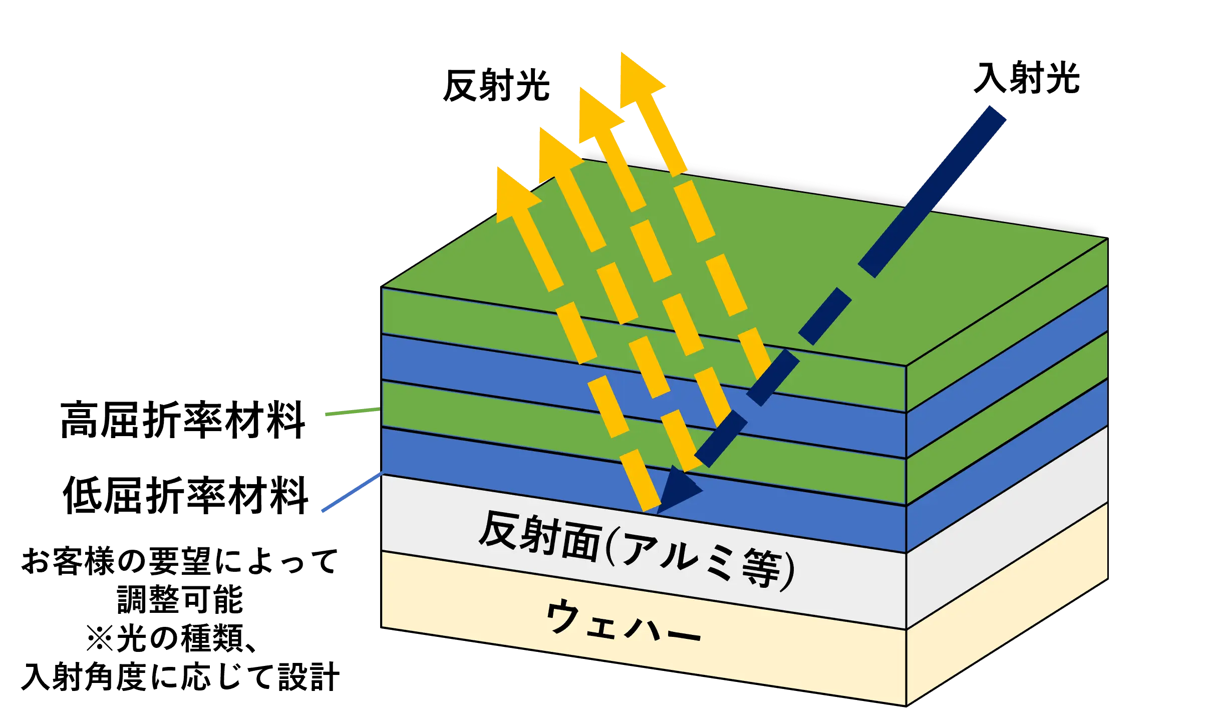 増反射膜は、左図に示すように、光の通過しやすさが異なる材料(高屈折率と低屈折率)を交互に積層することで、より多くの光を効率的に反射することが可能になります。(各層で反射された光の位相がそろい、光が強められるため)本来この膜は光学素子の表面に使われますが、当社では半導体の基板となるウェハー上に形成し、光を効率よくコントロールする用途に活用しています。ウェハーとの密着性を高めるとともに、その後の半導体プロセスを考慮した膜構造となるよう工夫して形成しています。
