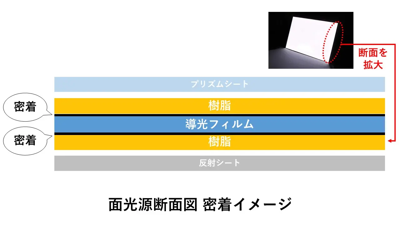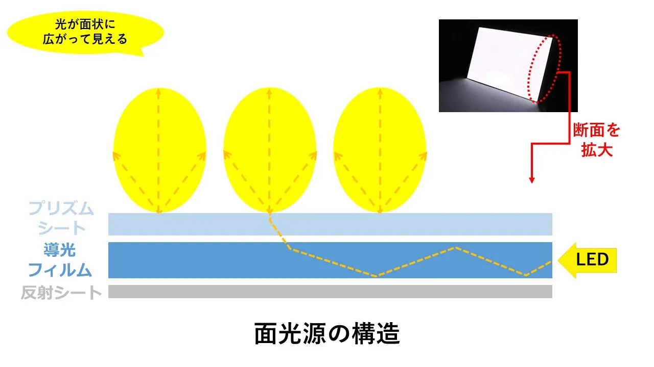 スタンレー電気の面光源製品は、導光板ではなく、より薄い導光フィルム*1 を使用しています。一辺から複数のLEDで照らした光をフィルム内部で反射させ、プリズムシート*2 を通して光を広げることで発光する構造になっています。*1 LEDの光源を面光源に変換するためのもの*2 光の屈折と反射を利用して光を特定の方向に集めたり分散させるもの