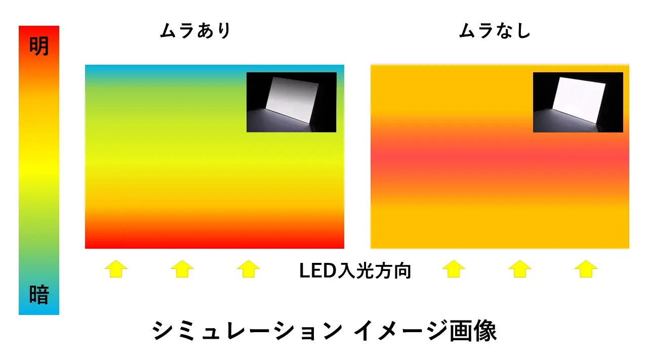 シミュレーションソフトを使い、画面サイズ全体における均一な明るさの実現と、特定方向へ光を集めることで高い輝度を実現しています。通常はLEDが配置されている一辺側が明るく、反対側が暗くなってしまいますが、光を反射させる角度をつけることで、全体の明るさが均一になるよう調整しています。また特定の方向に光が集中するよう調整することで、同じ電力でも輝度が高くなり、省電力にもつながっています。