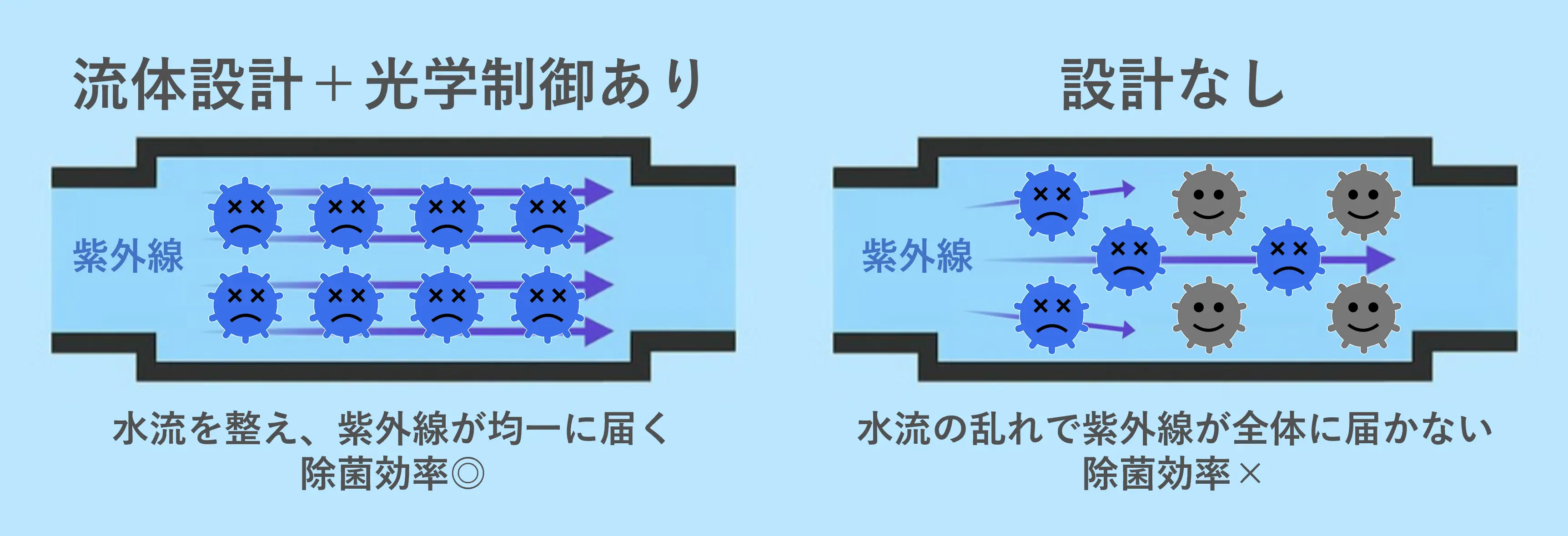 紫外線を対象物にムラなく、効率よく届けることで、除菌効果を最大化する技術です。