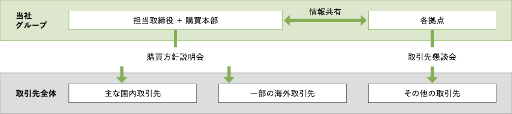 この結果を受けて当社グループではカテゴリー❶原材料のCO₂排出量のうち、特に樹脂材料におけるCO₂排出量削減を重点課題とし、よりCO₂排出量の少ない樹脂への変更などの削減方法の検討を開始しています。一連の活動には当社単独ではなく取引先と共同で取り組むことが重要であり、当社サプライチェーンにおけるCO₂排出量が多い取引先から優先的にCO₂排出量の削減活動を進めていきます。主要な取引先に対して当社グループの購買方針や持続可能な調達に向けた人権、リスク等事業活動に必要な協力を要請する購買方針説明会を開催し、この機会を通して当社グループのサプライチェーンにおけるカーボンニュートラルについて理解と協力を求めています。さらに、各拠点が開催する取引先懇談会を通じてその他の取引先に説明を行い、言語の違いや取引の大小にかかわらず広く削減に向けた体制が浸透するよう働きかけています。