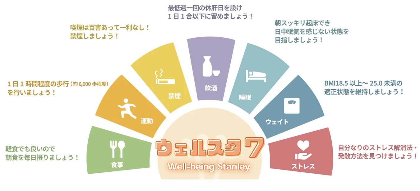スタンレーでは健康経営を推進するにあたり、社員の心身の健康の保持・増進のために望ましい健康行動7つを「ウェルスタ7」として定め、それに紐づけた指標の設定、健康施策の展開を行っています。「ウェルスタ7」とは、食事、運動、禁煙、飲酒、睡眠、ウェイト、ストレスの7項目で、いずれも心身の健康と業務パフォーマンスを向上させるうえで欠かせない要素です。