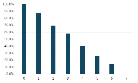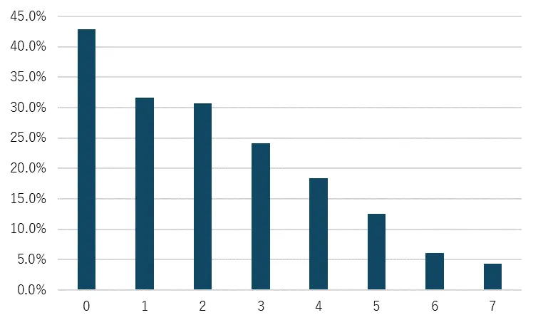 ウェルスタ7の推進状況の評価にあたっては、各項目の実践状況を基に指標化を行っています。各項目が実践できていれば各1点、実践できていなければ各0点とし、合計0点~7点のウェルスタ7スコアを算出し、全社および各事業所の推進状況をモニタリングしています。(2023年度下期に本指標を定め、2024年度から施策を本格展開、今後検証・改善。)